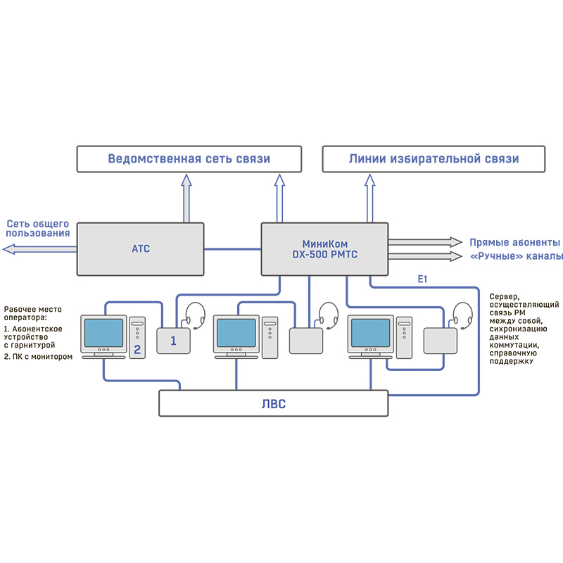 МиниКом DX-500 РМТС поддерживает работу до 16 рабочих мест, каждое из которых может быть сконфигурировано как РМ старшего телефониста, РМ оператора стола заказов, РМ оператора. Архитектура системы дает возможность гибко распределять соединительные линии по рабочим местам операторов.
