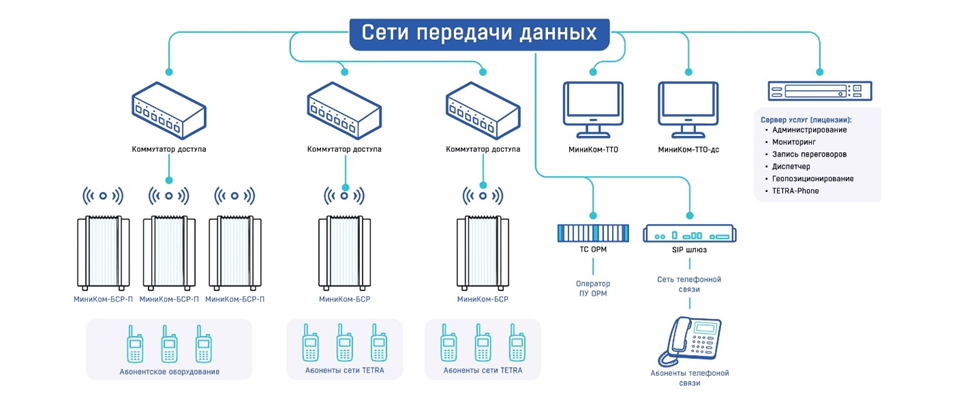 МиниКом БСР-П поддерживает разные архитектуры систем подвижной радиосвязи комплекса МиниКом-TETRA:
